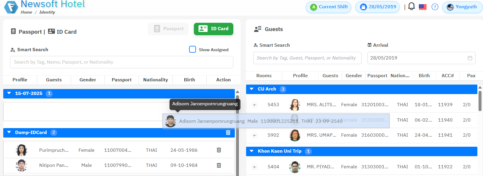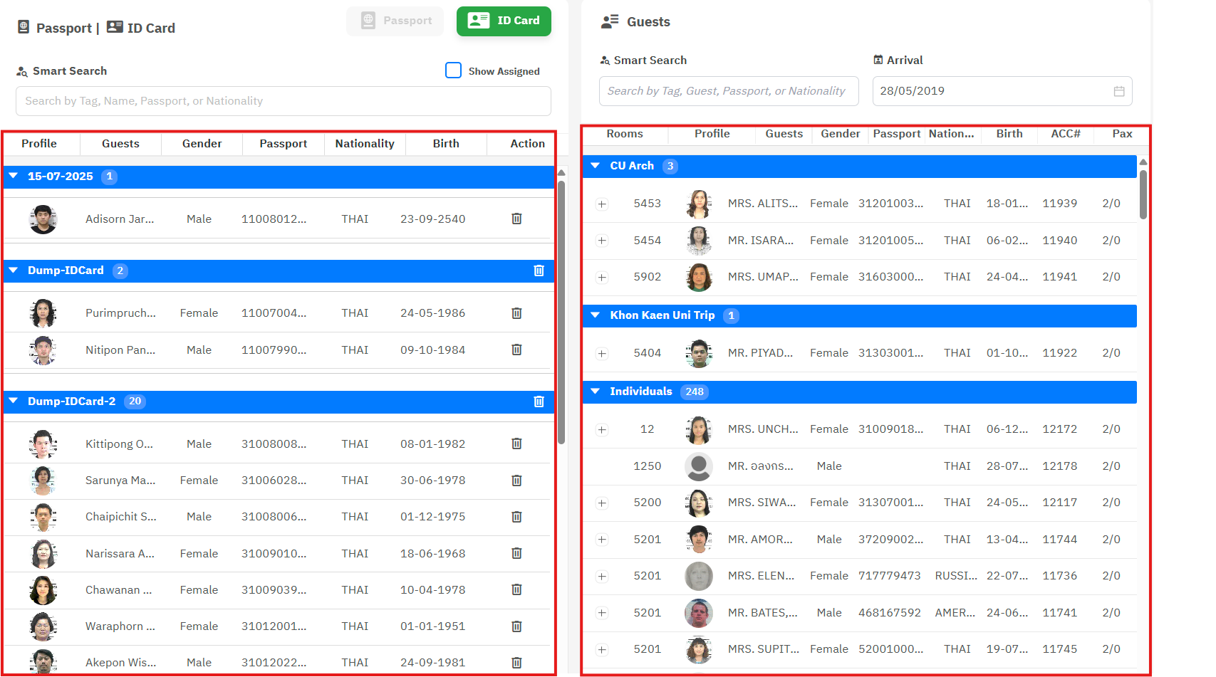 ด้านซ้าย เป็นข้อมูลที่ได้จากการอ่านเอกสาร (พาสปอร์ต / บัตรประชาชน) ไว้ล่วงหน้า ทางโรงแรมจำเป็นต้องมีเครื่องอ่านพาสปอร์ต และเครื่องอ่านบัตรประชาชน ฟังก์ชั่นนี้จึงจะสามารถใช้งานได้