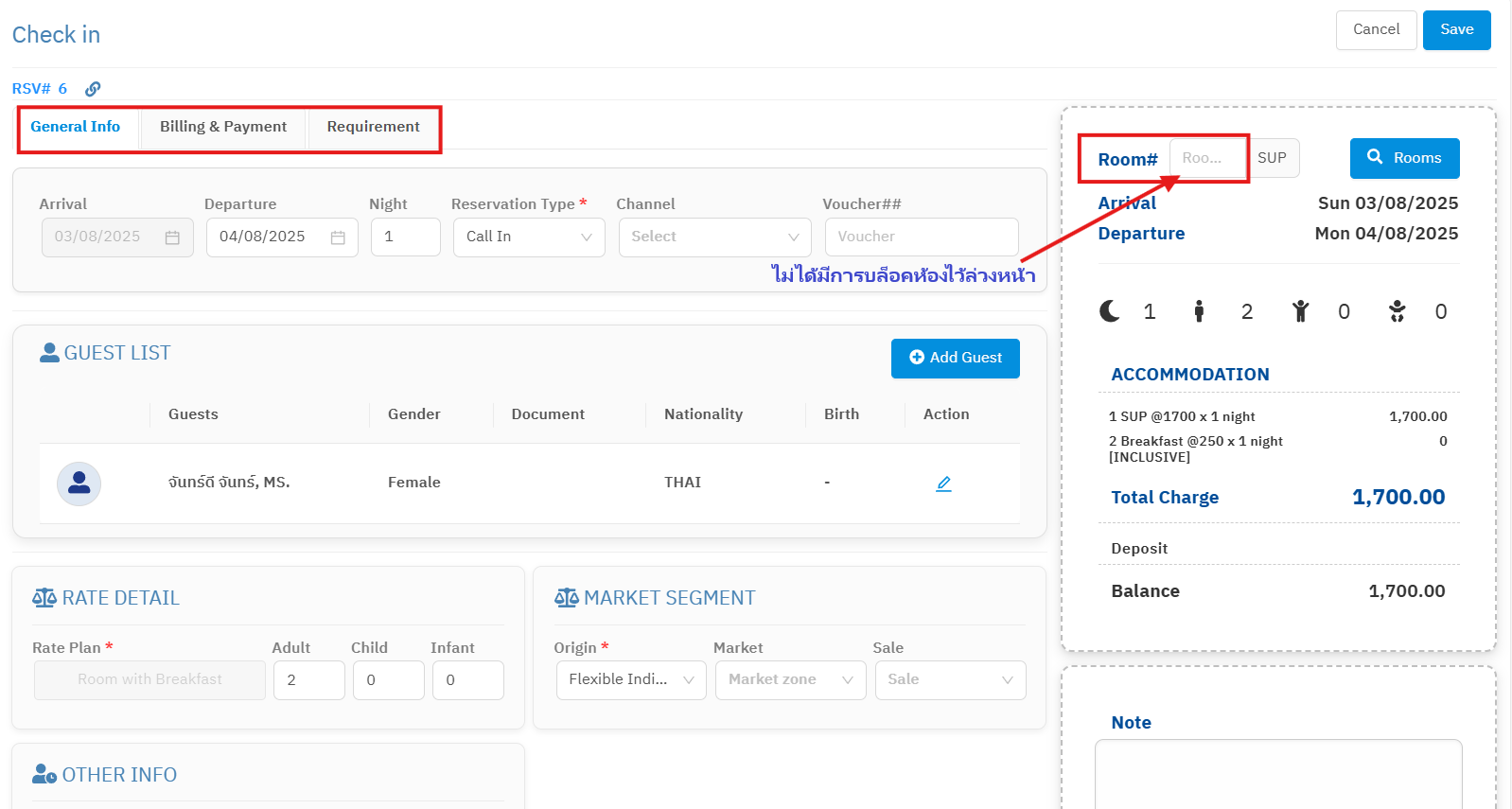 รายละเอียดในส่วนนี้ จะถูกคัดลอกมาจาก Booking info ในตอนทำการจอง ซึ่งในขั้นตอนการทำเช็กอินนี้ ระบบยังอนุญาตให้ผู้ใช้สามารถแก้ไขรายละเอียดต่างๆ ได้ทั้งหมด รวมถึงชื่อแขกใน Guest List (รายชื่อแขกพัก) ดูวิธีการได้ที่ การสร้าง / แก้ไขข้อมูลแขกพัก