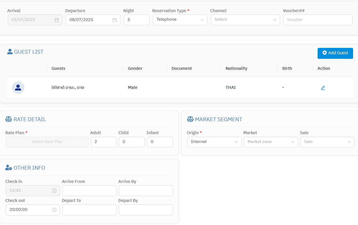 รายละเอียดในส่วนนี้ จะถูกคัดลอกมาจาก Booking info ในตอนทำการจอง ซึ่งในขั้นตอนการทำเช็กอินนี้ ระบบยังอนุญาตให้ผู้ใช้สามารถแก้ไขรายละเอียดต่างๆ ได้ทั้งหมด รวมถึงชื่อแขกใน Guest List (รายชื่อแขกพัก) ดูวิธีการได้ที่ การสร้าง / แก้ไขข้อมูลแขกพัก
