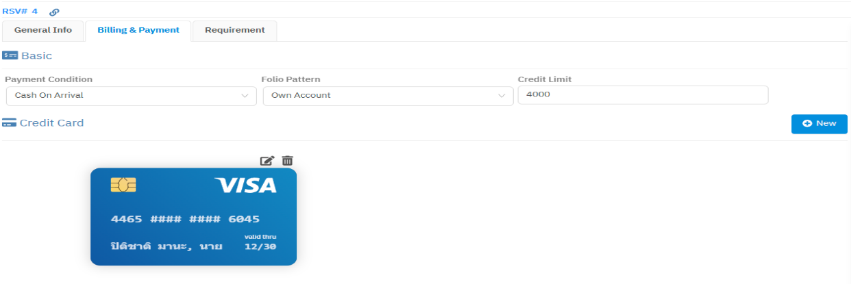 ข้อมูลในส่วนนี้ก็ถูกคัดลอกมาจาก Billing & Payment ในตอนทำการจองเช่นเดียวกัน แต่ระบบยังอนุญาตให้ผู้ใช้สามารถแก้ไข หรือบันทึกเพิ่มเติมได้ถ้าไม่ได้ถูกบันทึกมาในขั้นตอนการจอง ดูรายละเอียดได้ที่ เงื่อนไข / การชำระเงิน