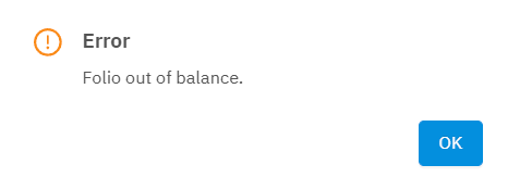 3. สำหรับกรณีที่แขกยังคงมียอดค้างชำระ (Folio Balance ไม่เท่ากับ 0 ทุกใบ) จะมีข้อความด้านล่างปรากฏขึ้น และระบบจะไม่อนุญาตให้ทำการเช็กเอาต์ ผู้ใช้ต้องทำการบันทึกรายการรับชำระ หรือทำรายการอื่นใดเพื่อปรับปรุงยอดใน Folio ของแขกทุกๆ ใบ ให้มียอดเป็น 0 ทั้งหมดก่อน จึงจะสามารถกลับมาทำการเช็กเอาต์แขกได้