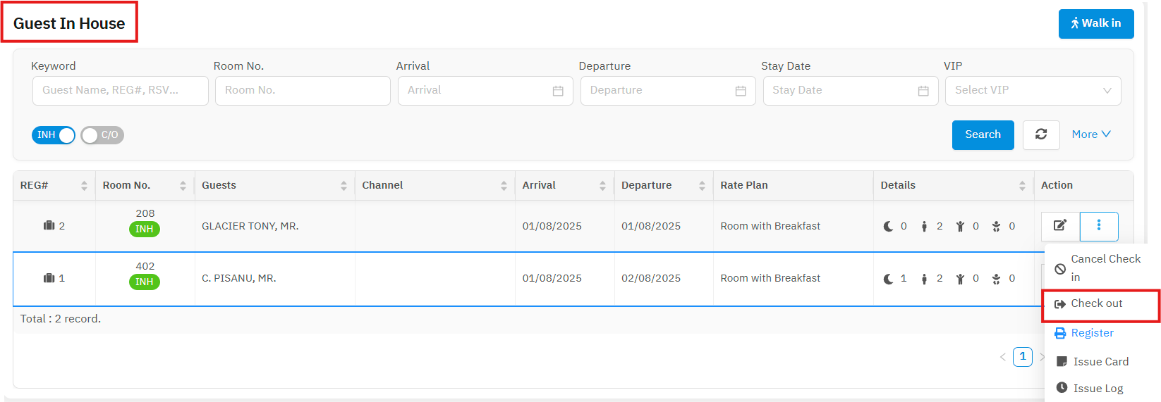จากภาพ จะเป็นสั่งเช็กเอาต์แขกจากหน้า Guest In House (รายชื่อแขกพัก) โดยการใช้ Mouse คลิกที่ปุ่ม Action เพื่อให้ระบบแสดงชุดเมนูย่อย แล้วเลือก Check out