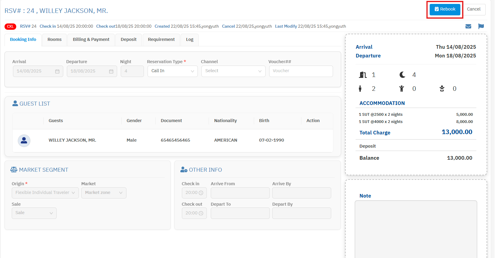 Booking ที่ถูกทำการยกเลิก (Cancel) ไปแล้ว ข้อมูลจะไม่ถูกลบออกจากระบบในทันที แต่ระบบจะเก็บข้อมูลการจองนี้จนถึงวันครบกำหนดการเข้าพัก (Arrival Date) ดังนั้น ก่อนถึงกำหนดการเข้าพัก ในกรณีที่ต้องการให้ Booking ที่ทำการยกเลิกไปแล้ว กลับมาเป็น Booking ที่มีสถานะปกติ (RSV) ก็สามารถทำได้โดยการการปุ่ม Rebook ตามภาพด้านล่าง