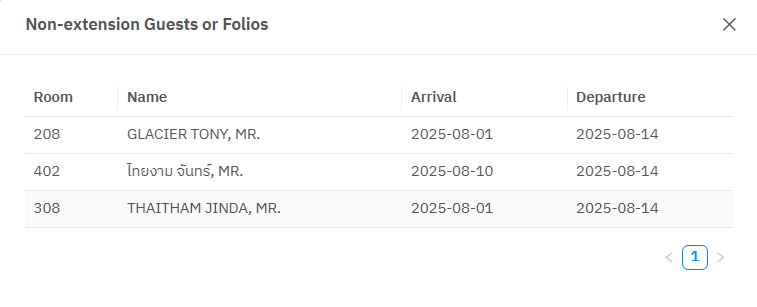 จากภาพ ระบบตรวจพบข้อผิดพลาดในขั้นตอนของการตรวจสอบก่อนการปิดบัญชีว่า มีแขกถึงกำหนดเช็กเอาต์แล้ว แต่ผู้ใช้ยังไม่ได้ทำการเช็กเอาต์ออกจากระบบ ในกรณีที่มีข้อผิดพลาดเกิดขึ้น ผู้ใช้สามารถเอา mouse ไปคลิกที่ link ในกรอบสีแดงตามภาพด้านบน เพื่อให้ระบบแสดงรายละเอียดของข้อผิดพลาดที่ตรวจพบ (ตามภาพด้านล่าง) เพื่อนำไปดำเนินการแก้ไขต่อไป