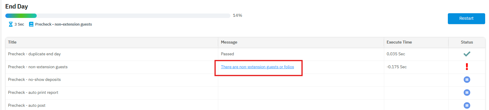 ตรวจสอบว่าเป็นการทำปิดบัญชีซ้ำหรือเปล่า และทำหลังเที่ยงคืนหรือไม่ - Precheck – non-extension guests