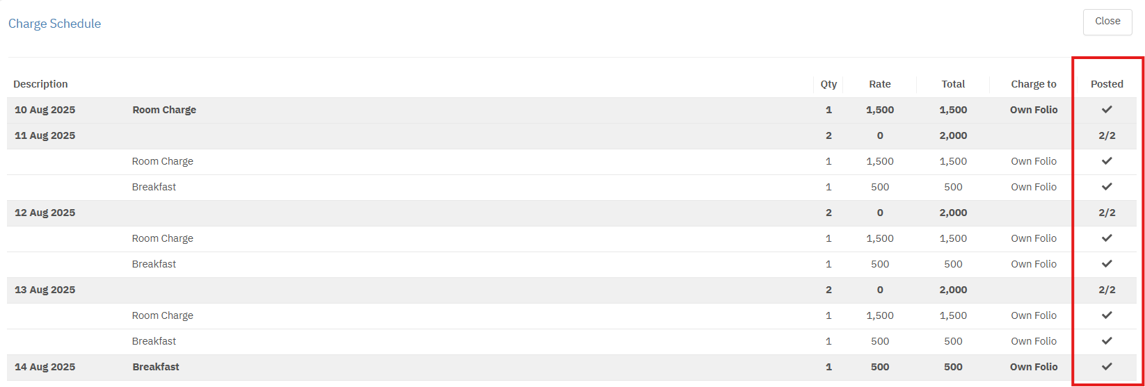 | Charge Schedule | สั่งให้ระบบแสดงรายการค่าบริการต่างๆ แบบรายวัน ตั้งแต่วันที่เช็กอิน ถึงวันที่เช็กเอาต์ตามภาพล่าง |