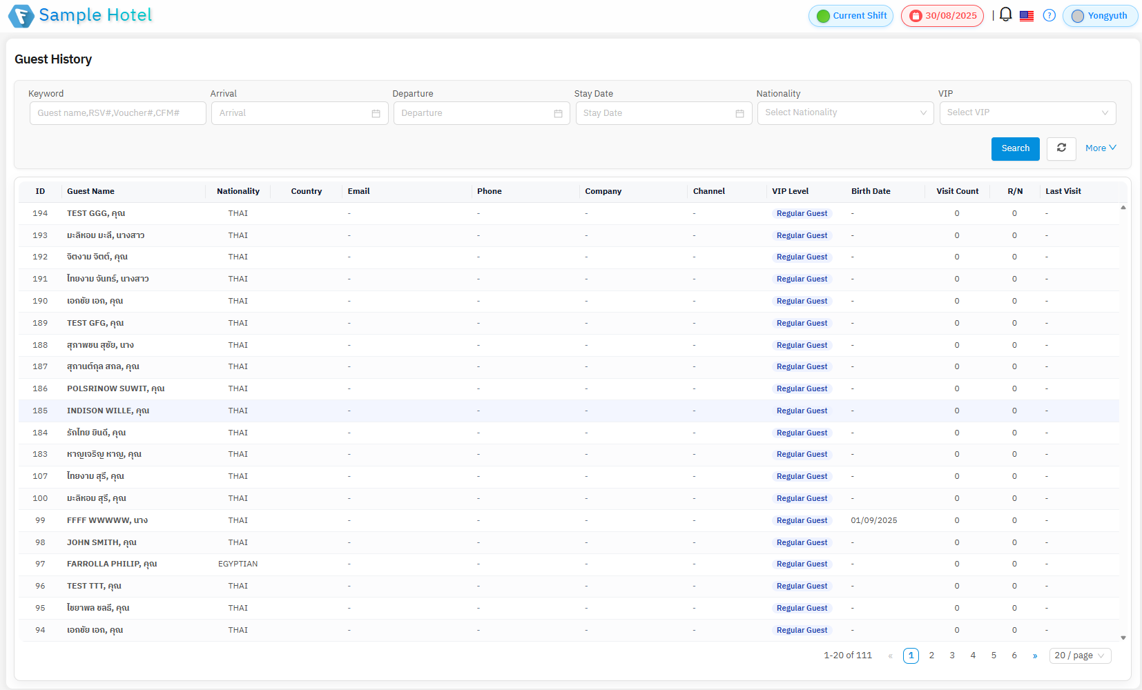 หน้าจอแสดงประวัติการเข้าพักของแขก