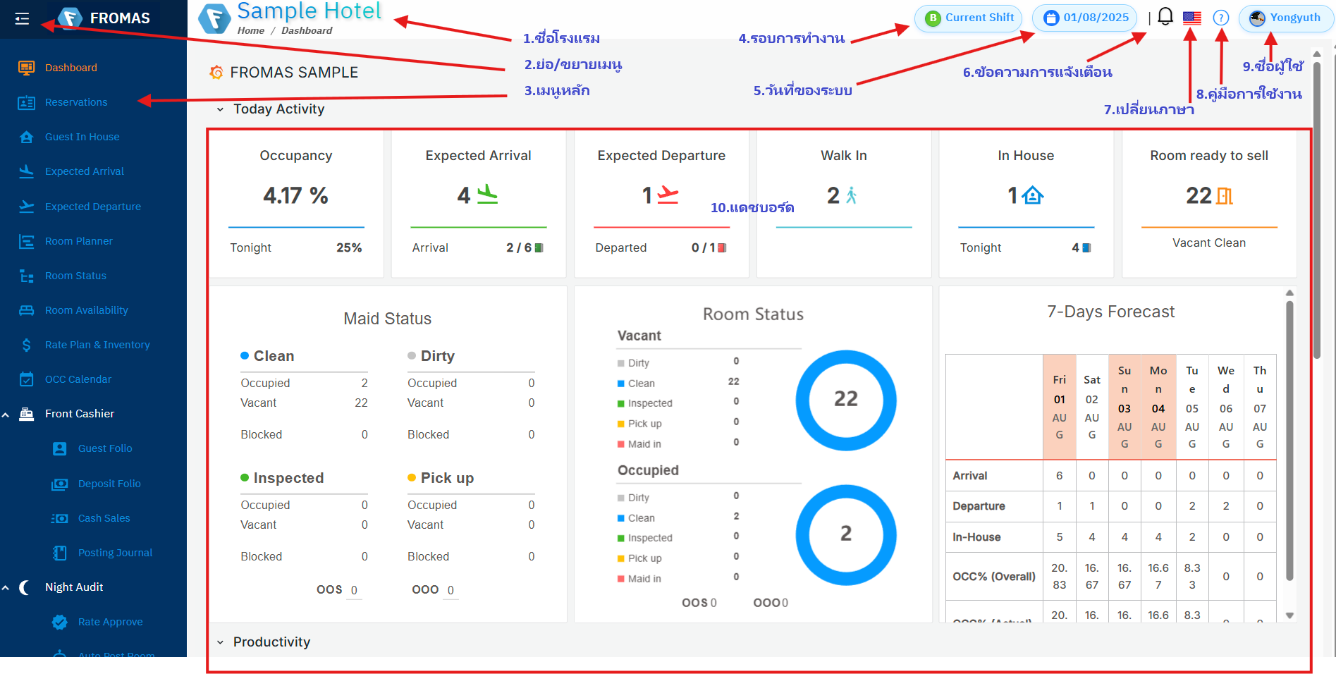 1. ชื่อโรงแรม แสดงชื่อโรงแรม/ชื่อฐานข้อมูล
