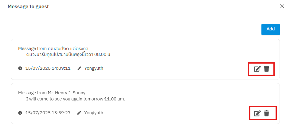 Message ที่ถูกสร้างให้กับแขกในหน้า Reservation (การจองห้อง) จะไม่ไปปรากฎในหน้า Guest In House (ผู้เข้าพักปัจจุบัน) เช่นเดียวกันกับ Message ที่ถูกสร้างในหน้า Guest In House จะไม่ไปปรากฎในหน้า Reservation