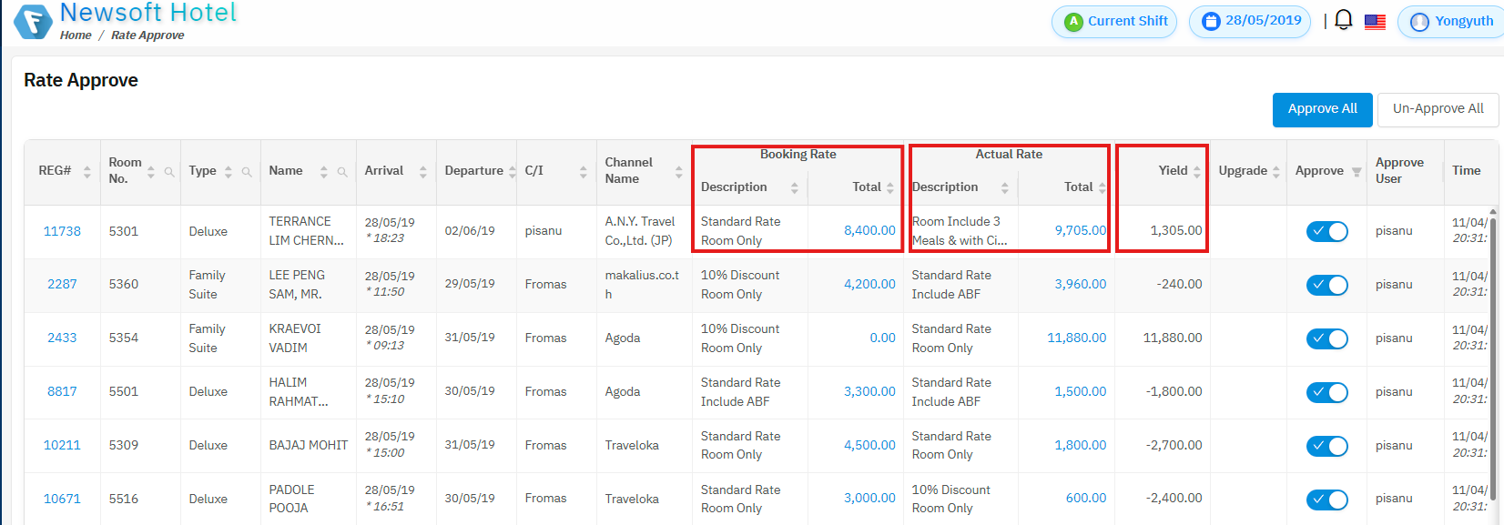 ส่วนช่อง Yield คือผลต่างระหว่างอัตราค่าห้องในขณะที่ทำจอง กับอัตราค่าห้องที่กำหนดให้ใหม่ในตอนทำเช็กอิน ซึ่งอาจจะมีการ Upgrade/Upsell หรือเกิดการผิดพลาดในตอนทำเช็กอิน ซึ่งทำให้อัตราค่าห้องไม่เท่ากับตอนที่ทำการจอง ในกรณีที่พบอัตราราคาที่ผิดปกติ ผู้ตรวจสอบสามารถเข้าไปแก้ไขข้อมูลให้ถูกต้องก่อนได้ที่หน้า Guest in House ก่อนกลับมาทำการ Approve (ยืนยันราคา) อีกครั้ง