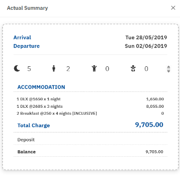 (ภาพทางด้านขวา) และเมื่อกดที่ Actual rate ระบบจะแสดงรายละเอียดของอัตราค่าห้อง ที่กำหนดไว้ในขั้นตอนการทำเช็กอิน โดยปกติถ้าไม่มีการ Upgrade / Upsell หรือเปลี่ยนเงื่อนไขอะไร Actual rate ควรจะเท่ากับ Booking rate ซึ่งค่า Yield จะเป็น 0