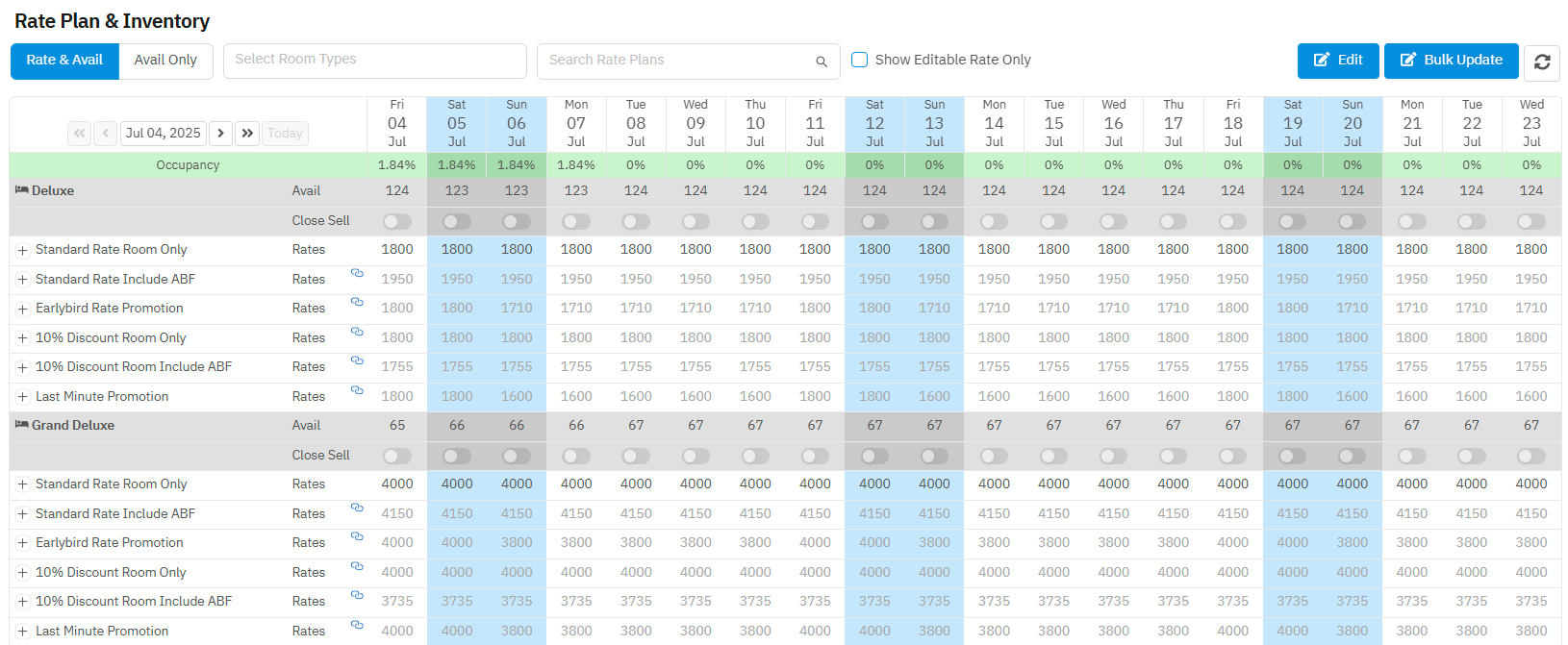 การแก้ไขราคาค่าห้อง หรือเงื่อนไขในการขายของแต่ละ Rate Plan สามารถทำได้โดยการ Edit หรือ Bulk Update ที่หน้าจอนี้เท่านั้น ซึ่งจะแตกต่างกัน ดังนี้