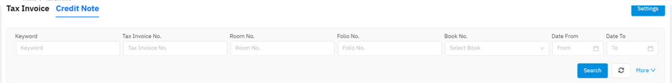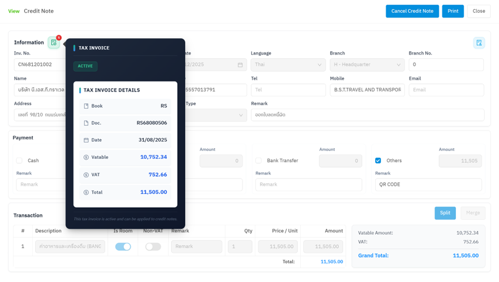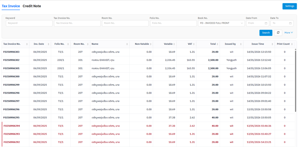 ในส่วนของหน้าจอ Tax Invoice / Credit Note (ใบกำกับภาษี / ใบลดหนี้) จะเป็นหน้าจอที่แสดงรายละเอียดของใบกำกับภาษี รวมถึงใบลดหนี้ที่ได้ออกให้กับแขกพักไปแล้ว ในขั้นตอนการรับชำระเงิน