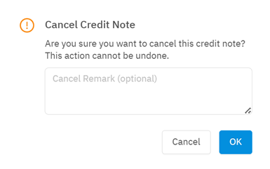 ในกรณีที่ต้องการยกเลิกใบลดหนี้ที่ได้ออกไปแล้ว ก็สามารถทำได้โดยการกดปุ่ม Cancel Credit Note (ยกเลิกใบลดหนี้) และใส่เหตุผลในการยกเลิก พร้อมกดยืนยันอีกครั้ง ตามภาพด้านล่าง