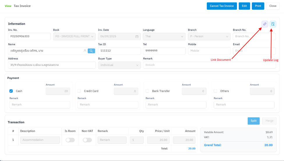จากหน้าจอนี้ จะมีปุ่มคำสั่งใหผู้ใช้สามารถทำการดูเลขที่เอกสารอ้างอิง (Folio#) ได้โดยการกดที่ปุ่ม Link Document ตามภาพด้านบน และสามารถเรียกดูประวัติการปรับปรุงข้อมูลของใบกำกับภาษีใบนี้ได้โดยการกดปุ่ม Update Log รวมถึงปุ่มคำสั่งต่างๆ ดังนี้